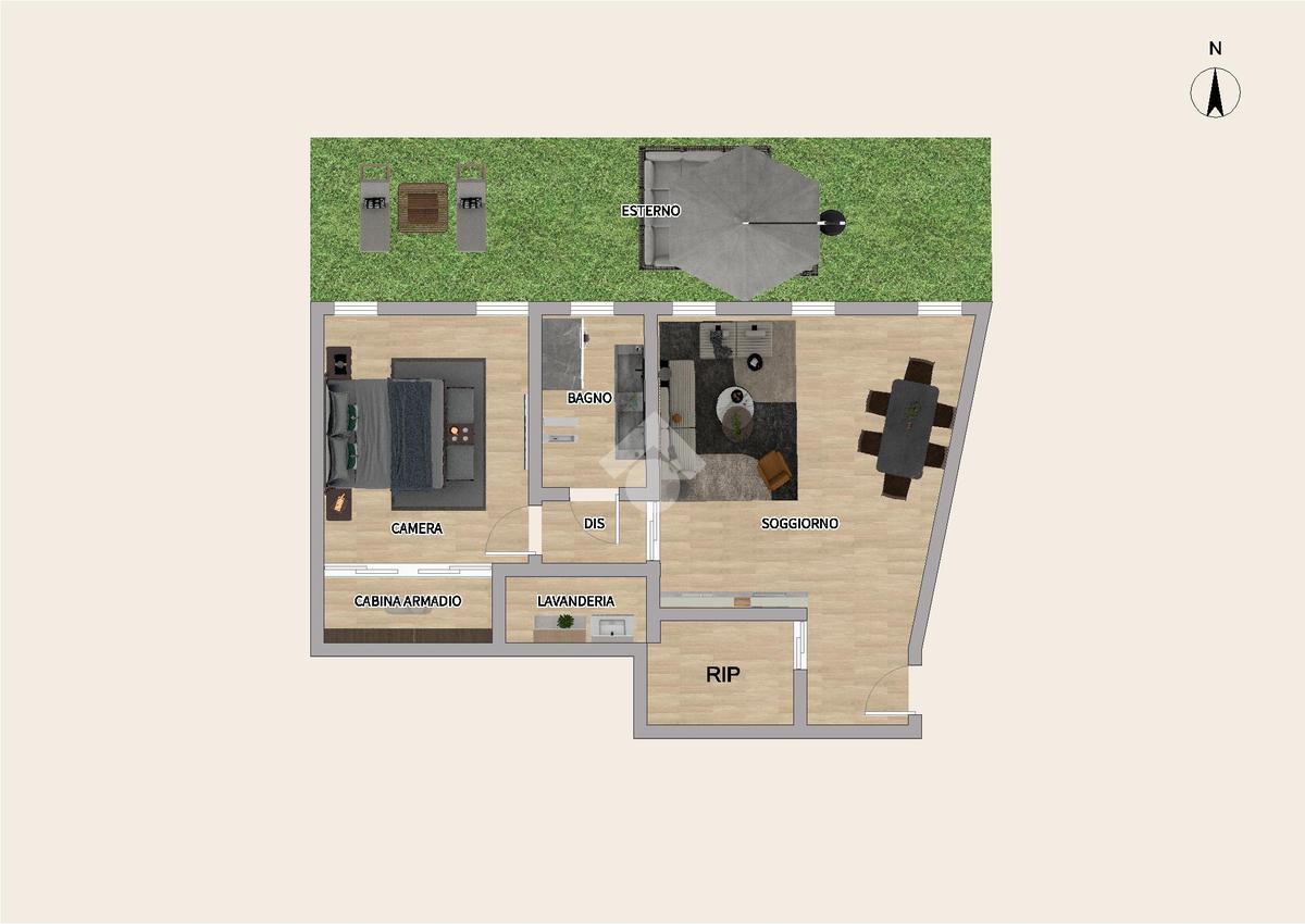 L’appartamento si compone di un ingresso che conduce alla luminosa zona living con angolo cottura, un ampio ripostiglio, disimpegno, bagno con doccia, lavanderia e una camera matrimoniale con cabina armadio. La camera si affaccia sull’area esterna di proprietà, uno spazio ideale per momenti di relax all’aperto.