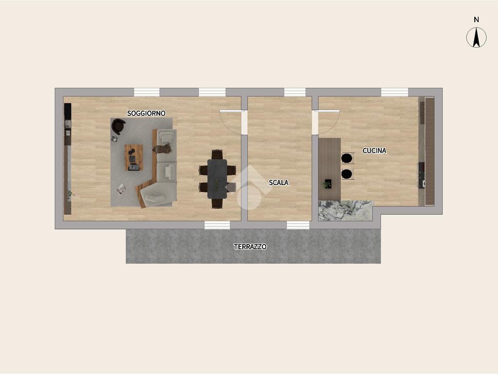 Primo Piano: zona giorno accogliente con soggiorno luminoso e terrazzo, oltre a una cucina abitabile ben separata e funzionale.