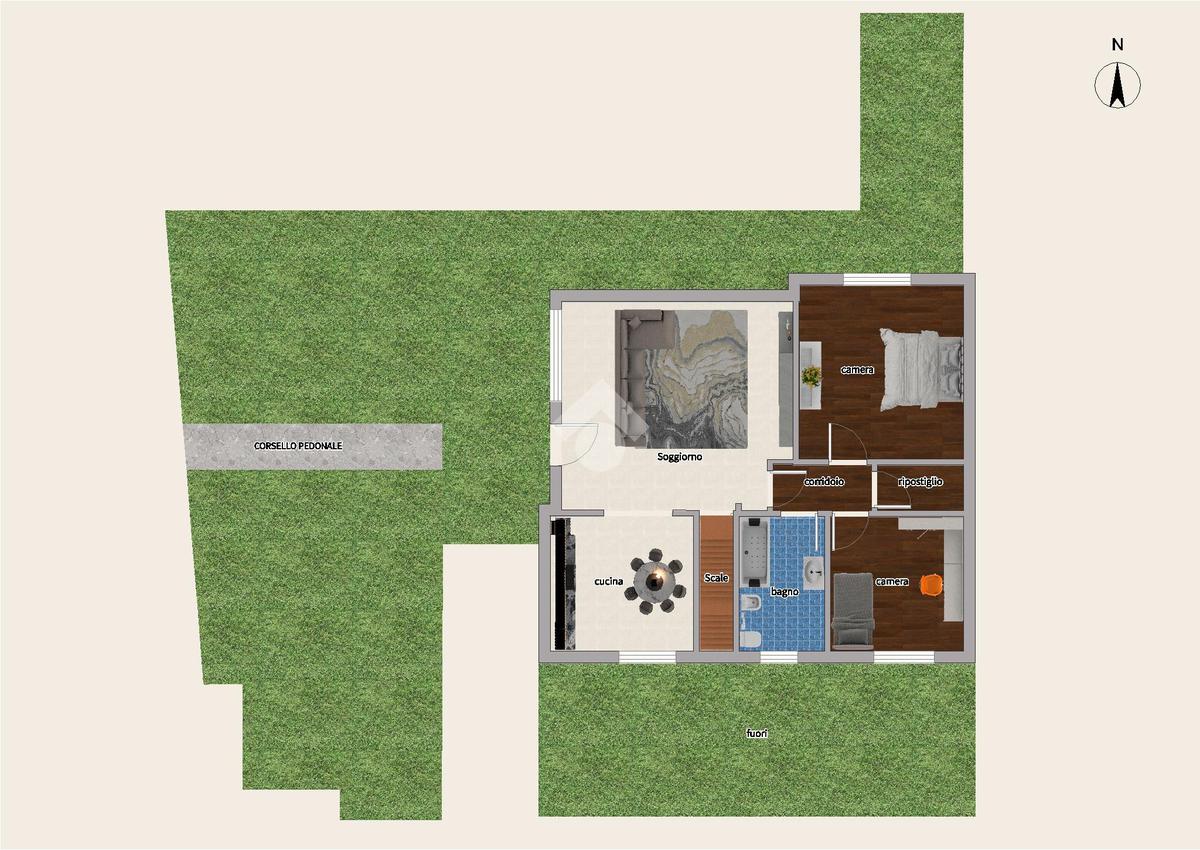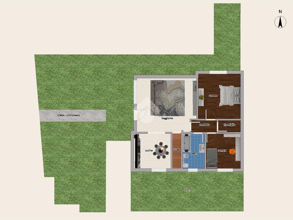 L’abitazione si apre su un curato giardino privato che accompagna all’ingresso indipendente.