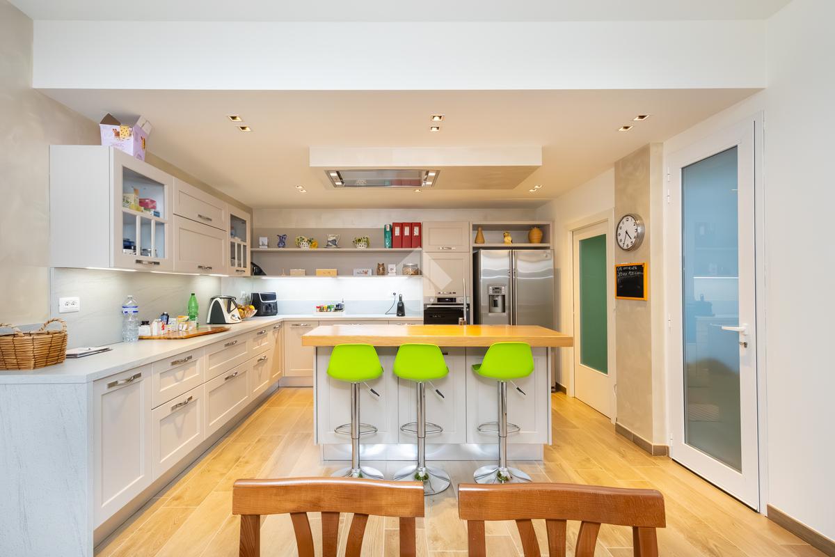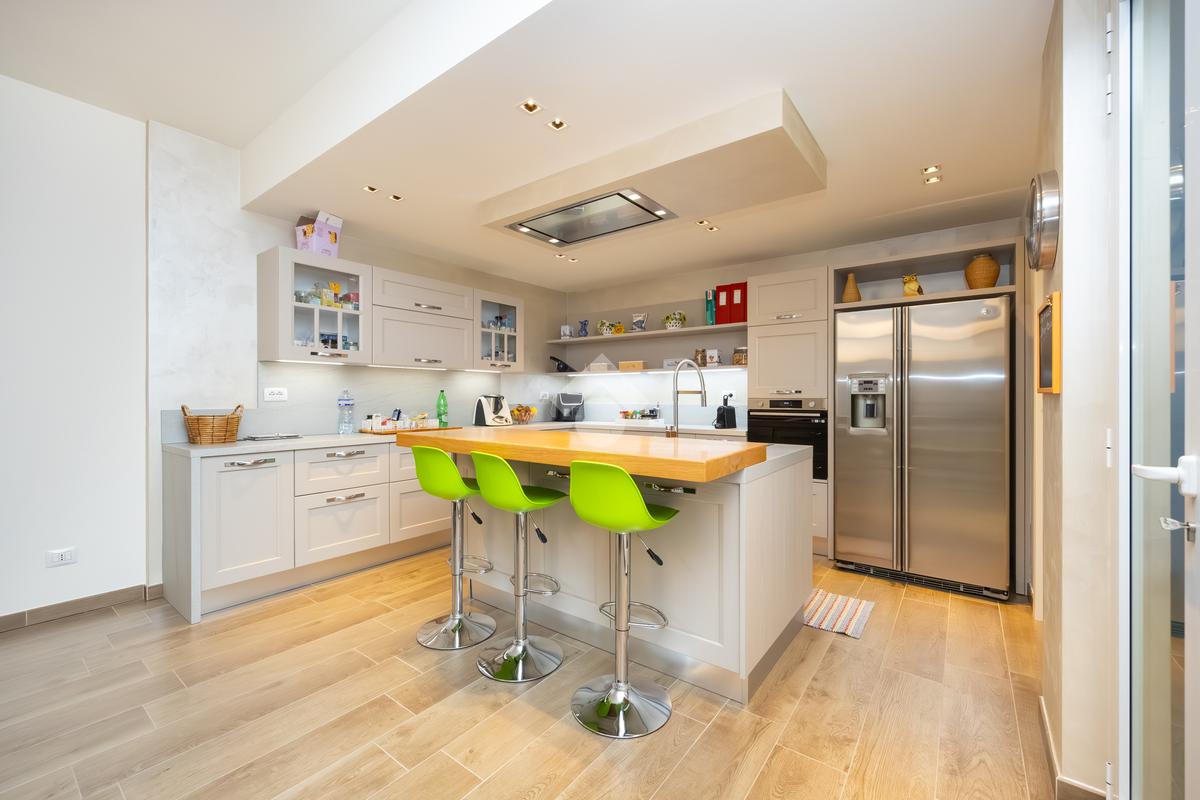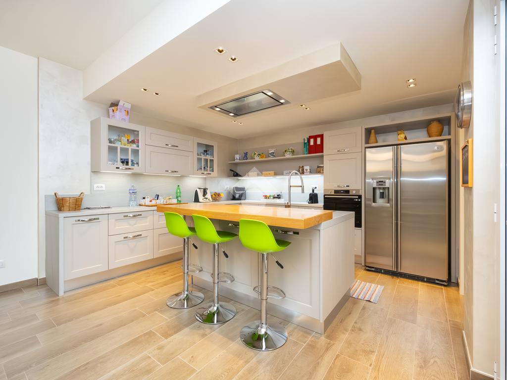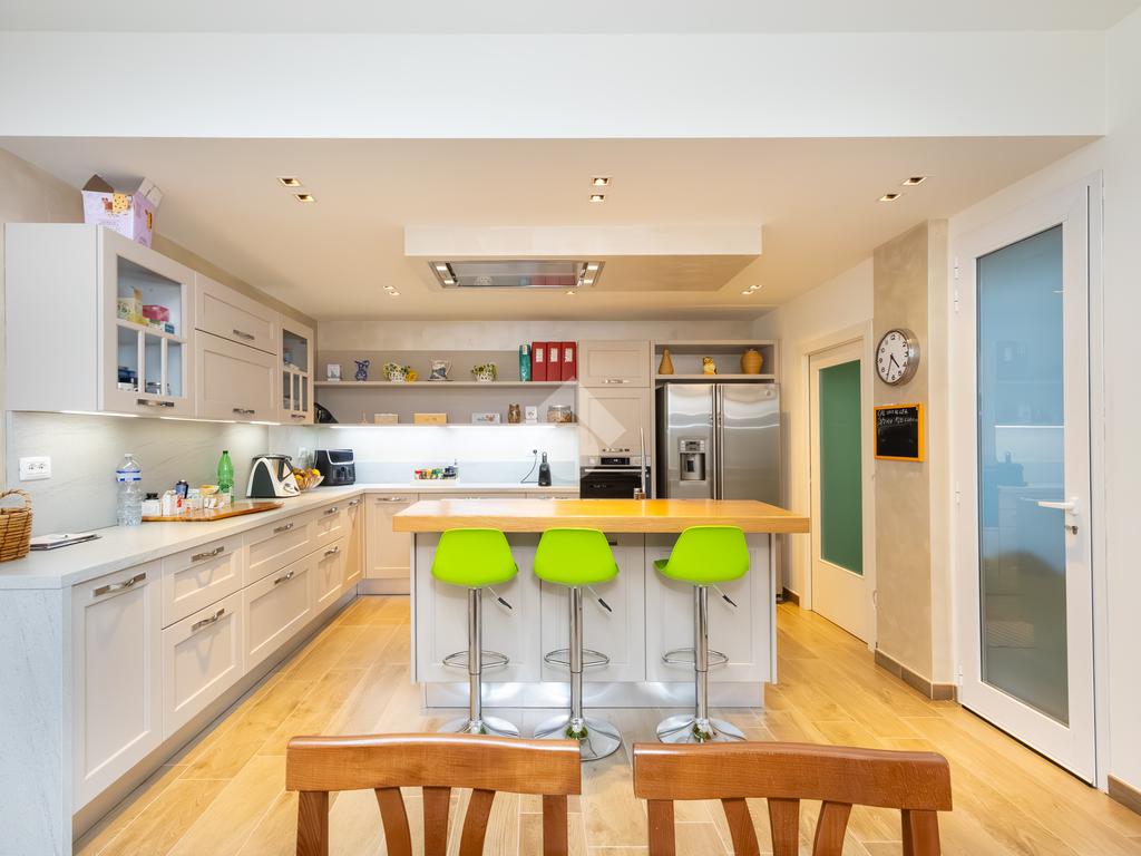 Il piano terra accoglie con una zona living di ampia metratura, valorizzata da cucina open space con isola centrale, soluzione moderna e altamente funzionale. Il livello è completato da disimpegno, bagno ospiti cieco con aspirazione meccanica e locale lavanderia di generose dimensioni.