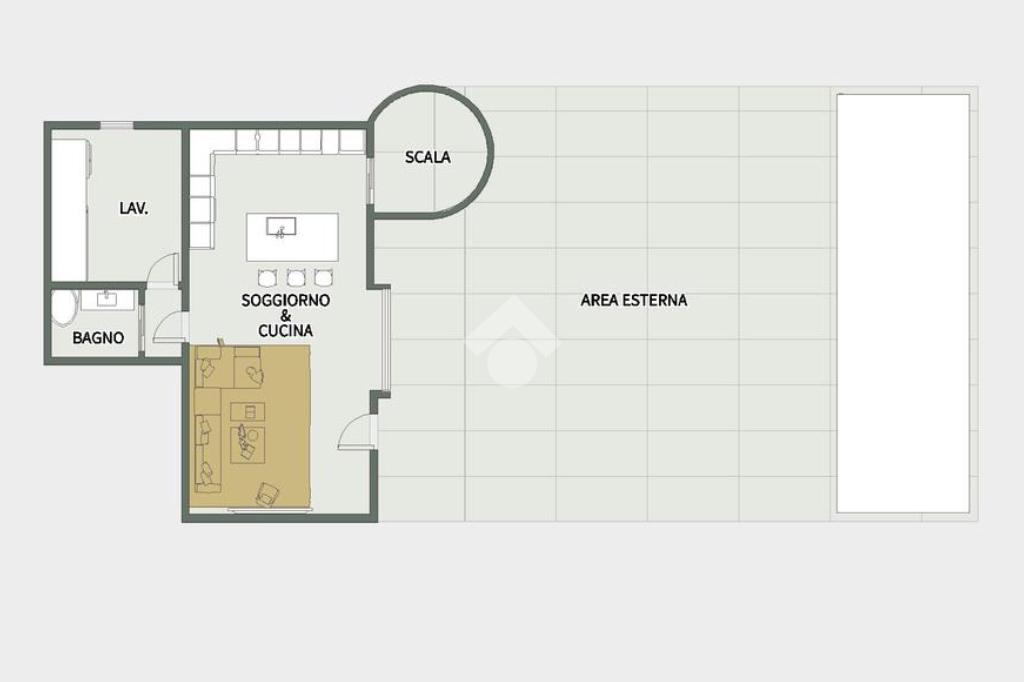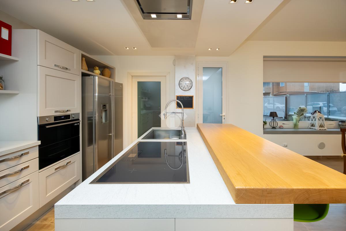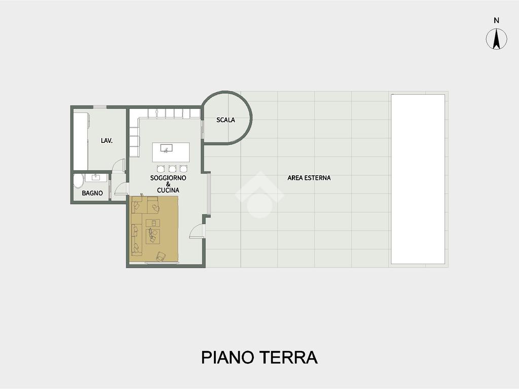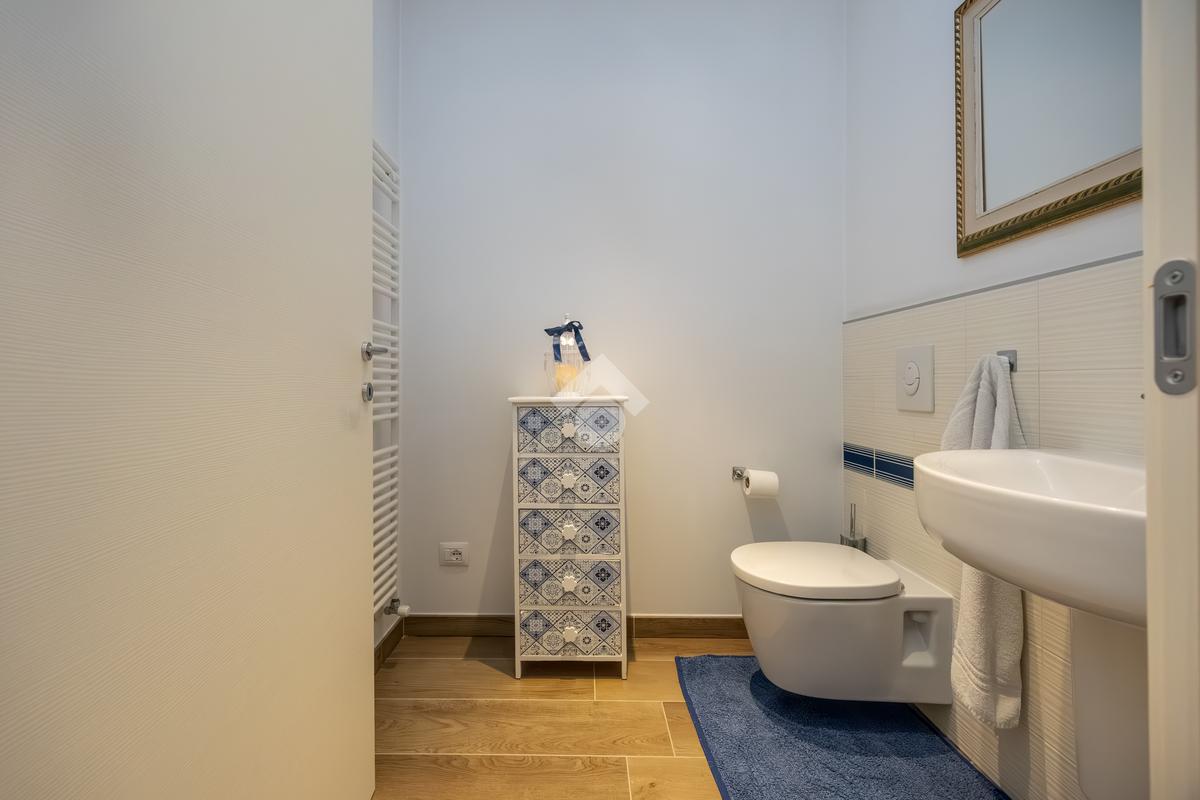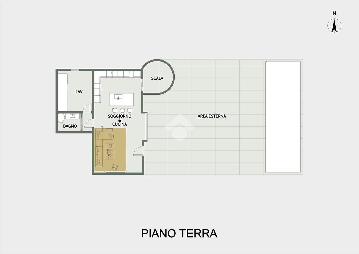 Il piano terra accoglie con una zona living di ampia metratura, valorizzata da cucina open space con isola centrale, soluzione moderna e altamente funzionale. Il livello è completato da disimpegno, bagno ospiti cieco con aspirazione meccanica e locale lavanderia di generose dimensioni.